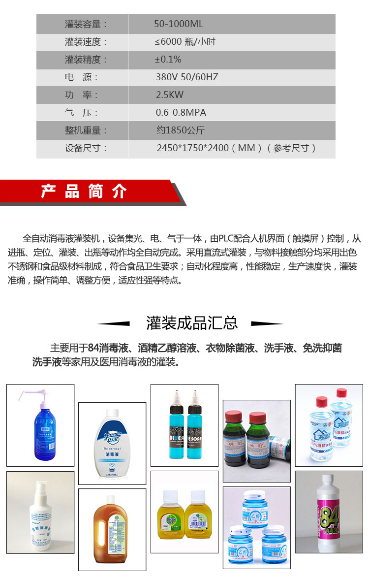 說到消毒液溶液,日常殺菌,還真是少不了它。消毒液溶液是一種非常常見的殺菌藥物,是采用氯酸鈉等成分加工而成,其中的“84消毒液溶液”為賓館、醫(yī)院、以及家庭消毒有著重要作用,企業(yè)及時洞悉市場動態(tài)迎合了消費者追求安全產(chǎn)品的需求,選用東泰機械自主研發(fā)的溶液全自動灌裝機,因這款溶液全自動灌裝機灌裝速度快、自動化程度高、生產(chǎn)效率高、適用范圍廣包含消毒液溶液、殺菌液、酒精溶液、滅菌液等,被各大、中、小企業(yè)所吸引。