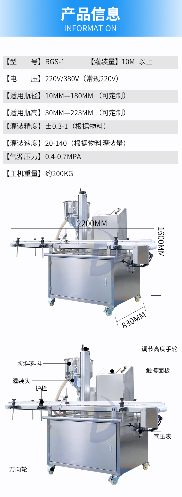 4、人機界面與PLC通訊,調試設備或更換品種只需在屏幕上設定。進瓶、定位、灌裝充填、出瓶均自動作業(yè)。