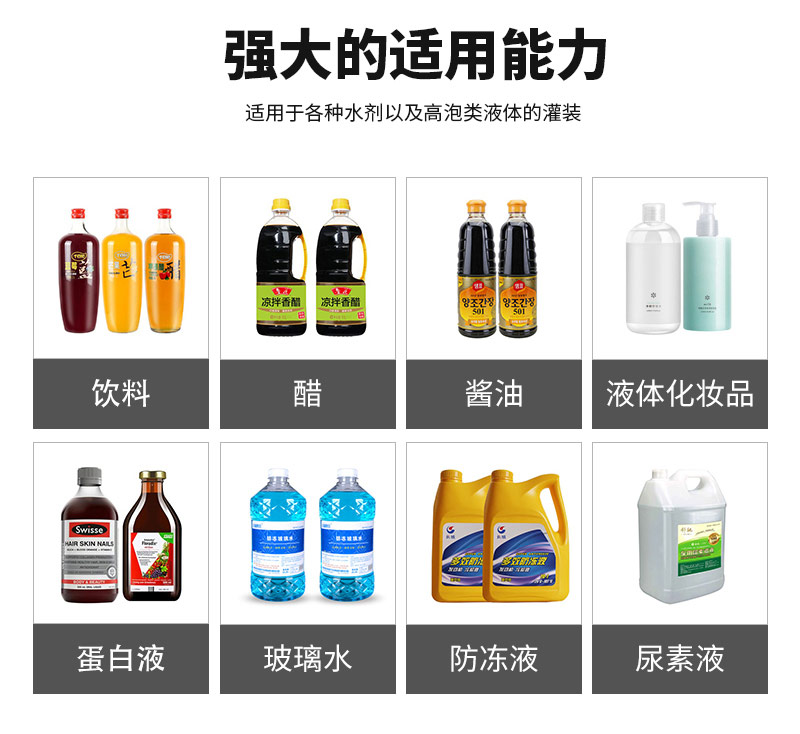 該灌裝機適用于各種水劑以及高泡類液體的灌裝。如:飲料、醋、醬油、液體化妝品、蛋白液、玻璃水、防凍液、尿素液等